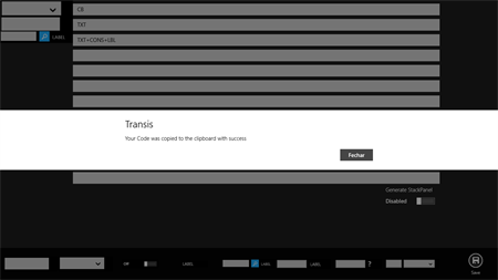 Transis AppMaker allows you to quickly and easily create prototypes of your Windows Store applications. Providing a basic set of Windows 8 Style tools, you can choose UI elements onto the design surface to arrange the layout and flow of your application. You can generate XAML script.