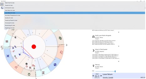 With Astro Nobel you can access all of your astrology charts, and also family and friends charts. It includes the Natal chart, Transits, Solar and Lunar return, secondary progressions and synastries; you can also add the chart of any life event for a person and accessing the transit dates for any planet in your natal chart.
