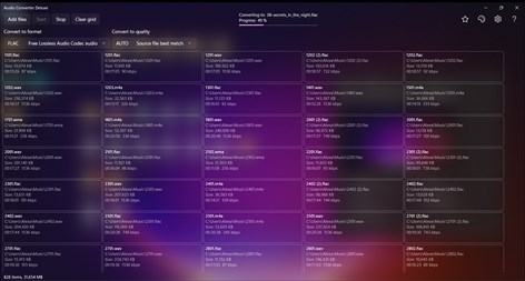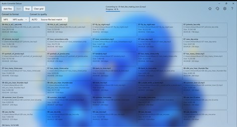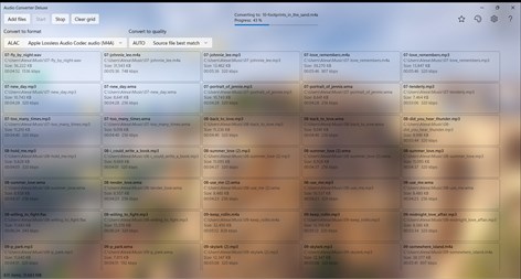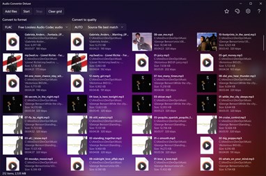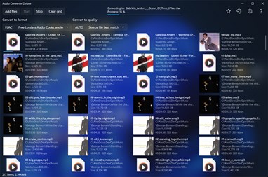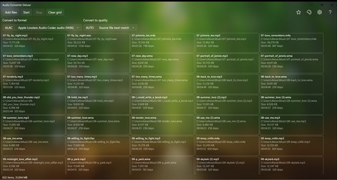 Application converts audio files between formats ALAC, FLAC, M4A, AAC, MP3, WAV, and WMA with Auto, High, Medium, and Low quality. Any combination of format and quality is possible. Conversion is also possible within the same format but different quality.
