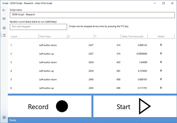 Automate mouse clicks using scripts. Auto Click Script allows easy recording of scripts. Once a script has been created, it can be played as many times as required.
