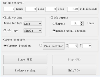 A full-fledged autoclicker with two modes of autoclicking, at your dynamic cursor location or at a prespecified location. The maximum amounts of clicked can also be set (or left as infinite). Choose whether to follow your cursor or click at a fixed spot Set the amount of times to click (or unlimited) Choose between which mouse button to click as Pick between single clicking, double clicking or triple clicking