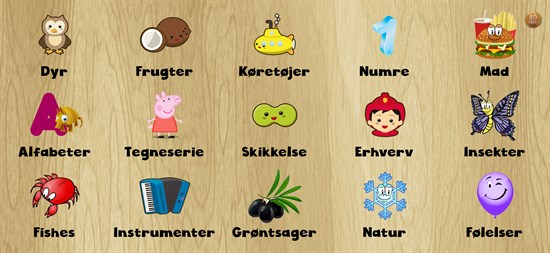 * Dyr: egern, panda, bi, abe, høne, and, pingvin, elefant, løve, ugle, hund og meget flere søde dyr. * Frugter: Ananas, citron, æble, jordbær, banan, kirsebær, pære, vandmelon, kokosnød osv. * Grøntsager: gulerod, majs, peber, radise, aubergine, blomkål, sort oliven, kål, chili osv. * Tal: 1, 2, 3, 4 op til 10 * Alfabeter: A, B, C, D op til Z * Insekter * Madvarer * Fisk * Køretøjer * Tegnefilm * Former * Profession * Instrumenter * Naturen * Følelser