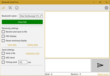 1. Receive the data from the Bluetooth serial port module and display it in the window. 2. The received data display mode can be selected as "string" or "HEX". 3. You can change the string encoding type in the settings. Supports multiple character encoding "ASCII", "GB2312", "UNICODE", "UTF-8", "BIG5", "shift_jis"