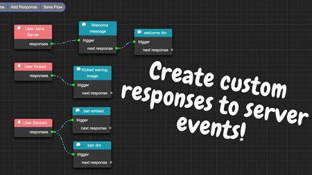 Text Commands- Create custom text commands which can be used to trigger responses by the bot. Examples of command responses: - Message (Send message, send image, send emoji, send random, etc) - User Action (Kick user, ban user, add role to user, etc) - Server Action (Add new role to server, etc) - Variables (Store values in variables and use them in other responses for truly custom bots)