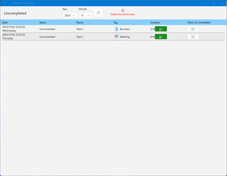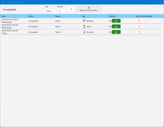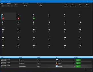 Key features: Custom category tags. You can modify the task status directly in the list. Each task can be associated with multiple subtasks. Count the number of subtasks associated with each task. Count the number of each task. The list of unfinished and completed tasks is displayed independently. Tasks that have already been completed can be changed to incomplete. You can delete tasks that have been completed in each month with one click. You can switch the language to use.