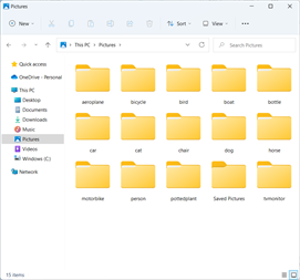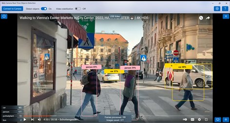 Frames containing recognized objects are saved as jpeg, jpg, bmp, png, gif, jpegxr, tiff, heif (Windows 11) or heic (Windows 11) pictures to respective folders.