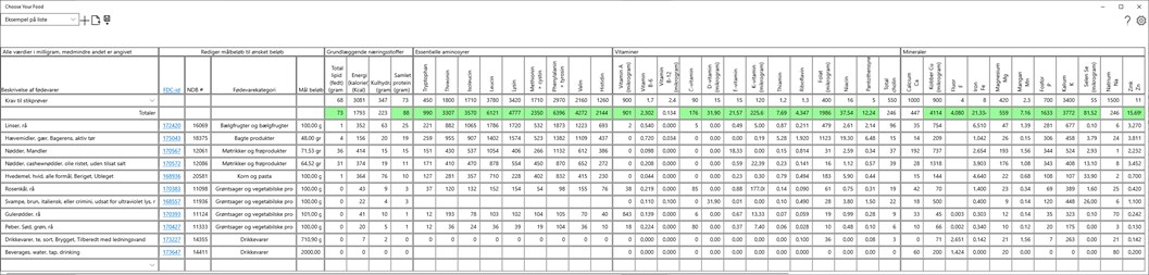 ChooseYourFood-appen giver brugerne mulighed for at filtrere, søge og sortere fødevarer efter beskrivelse, kategori eller næringsindhold. ChooseYourFood-appen giver brugerne mulighed for at organisere madvalg i grupper og tilpasse mængderne af hver madvare til opskrifter og hele måltider.