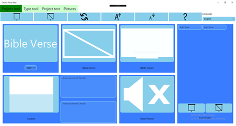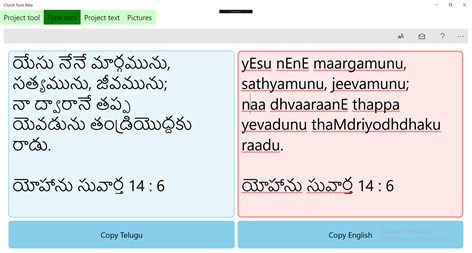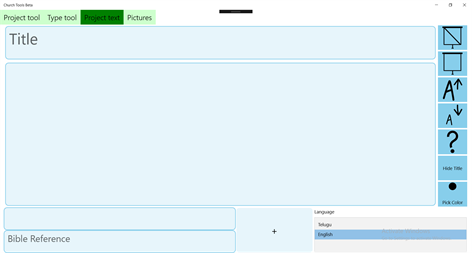 The app "Church Tools Beta" is made to be helpful in the church. You can use it for other purposes but make sure you don't involve it in any sinful deeds(According to the "Bible"). This application is still a beta version and may contain bugs. This app comes with features like Projecting Announcements and Bible Verses, Telugu typing using English (this app is not a translator, it just forms Telugu text based on typed characters in English!*) and more. The functionality of some features is limited. And most of the features are not available on the mobile platform.