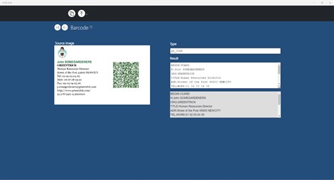 However, COM-SCN can also be used to do OCR on any image with text. COM-SCN is able to read "QR Code" but also all the following types of bar codes: Aztec, Codabar, Code 39, Code 93, Code 128, Data Matrix, EAN-8, EAN-13 , ITF, PDF-417, RSS-14 (all variants), UPC-A and UPC-E. COM-SCN can generate Aztec, Code 39, Code 128, Data Matrix, PDF-417 and "QR Code" barcodes from a vCard file or from free text.