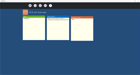 COM-SCN is an application for "optical character recognition" (OCR), handwriting recognition, barcode reading, barcode generation, business card generation, event card and gift card.