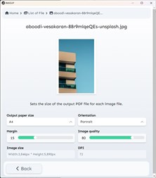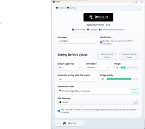 - The image data formats that can be combined are jpeg (jpg), png, webp, and gif. - For each imported image file, it is possible to adjust the paper size, orientation (portrait, landscape), and margins of the output PDF file. - The destination and file name of the generated PDF files can be changed arbitrarily. - One PDF page per image data is output to the full width of the image data. - Image quality can be adjusted during PDF output. (This does not affect the original image file.) - PDF output is available in 6 sizes: A3, A4, A5, B4, B5, and B6. Margins can be set from 0px to 50px. - All processing is completed on the terminal, so it can be used in an offline environment. - Since there is no communication via the Internet, there is no external linkage of terminal information. - When image data is imported by specifying a folder, only the image data in the specified folder that can be converted by IMASUP is imported for conversion.