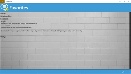 Get some of the best comebacks and be ready next time someone tries to insult you. From comebacks for relationships, sarcasm, wittiness to just the general comebacks, this app has them all. Want to return the burn? Now you can! So many features for FREE, how can you pass it up?