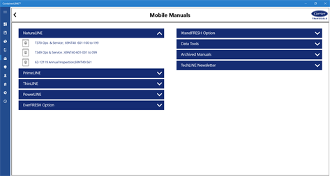 The Carrier Transicold ContainerLINK™ service app offers interactive resources for customers and service technicians, including: • Service manuals with instructional videos • Alarm code lookup function • Technician toolbox • Event description library • TechLINE articles • Warranty information • Training schedule • Service center locator • Repair Registration Tool • Troubleshooting guide for Carrier trained technicians