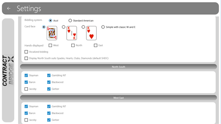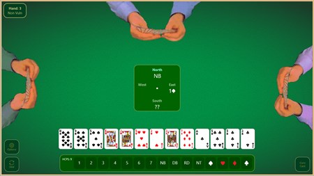 A random deal Contract Bridge simulation with Standard American and Acol bidding. The app allows one player to play a complete game with the computer controlling the other hands. A fresh random deal (with high point and revolve options) can be selected at any time. The in depth feature set includes selectable conventions, bidding sheet reference, viewable hands and selectable end of trick delay. The app features a Bridge engine with more than ten years of development. Two major updates in 2020 brought improved reliability and features.