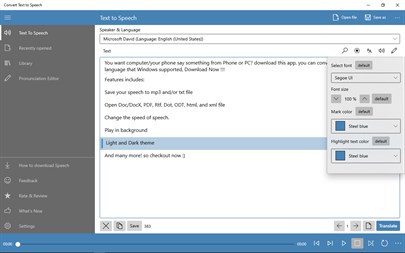 Features : - New design & user interface. - Save your speech to mp3, m4a, wav, and/or txt file. - Speech SliderBar control. - In Windows 10 build 14393 or later, now you can play speech in Background (due to windows limitation). but for earlier version you can try my workaround, type your speech => save to mp3 file => play with music player (eg. Groove Music). - You can open EPUB file. - You can open Doc/DocX, PDF, Rtf, Dot, ODT, html, and xml file. - You can open Subtitle file (e.g SubRip (.srt), MicroDVD (.sub), SubStation Alpha (.ssa, .ass)) - Control the volume and speed of speech. - Support for password-protected Word file and also for PDF file. - Added ability to search, sort and select in Library page. - "How to download Speech" page to help download Speech language. - You can translate your text to any language, (powered by Google Translate) - Save AutoRecover - Search speech text