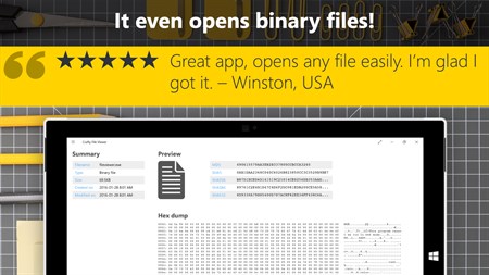 Binary files are no mystery for Crafty File Viewer, with its blazingly fast Hex Dump view. At a glance you’ll see what’s inside any binary file.