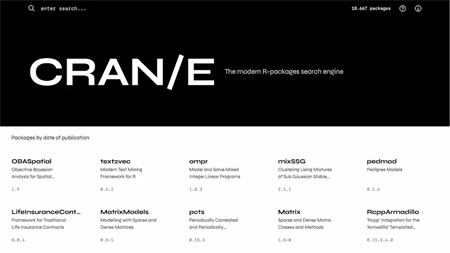 CRAN/E is a modern application that serves as a search engine and information display for packages hosted on CRAN. CRAN/E means The Comprehensive R Archive Network, Enhanced.