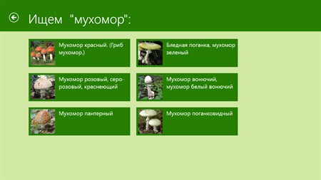 Все грибы разделены на 3 категории: несъедобные, съедобные и ядовитые. В приложении присутствует поиск.