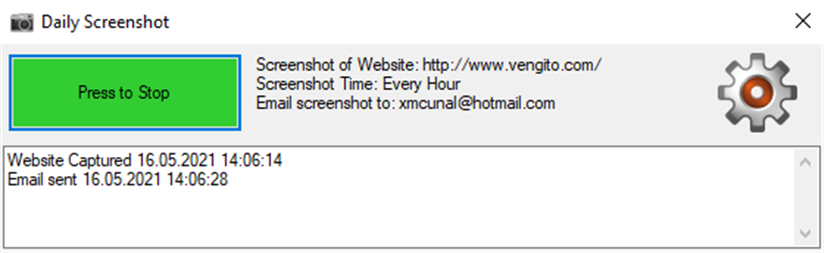 Take screenshots and send them automatically via email. Set your screen resolution to 1280x720 for full-screen images. The computer should not be in use while the website screenshot is being taken. Daily Screenshot sends email automatically every hour or once a day with one of following attachment: - Screenshot of a website - Screenshot of running computer Beside attachment website URL or name of comuputer will be sent via email. This tool can be so configured that it will start and will be active on Windows start up. Daily Screenshot can only be closed by the exit button that opens when the icon in the taskbar is pressed with the right mouse button.