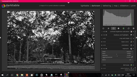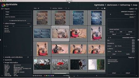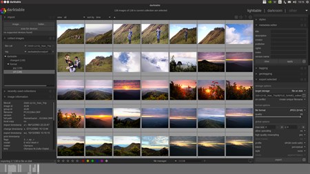 Lighttable The left panel is for importing images, displaying Exif information, and filtering. Rating and categorizing buttons are at the top, while the right-side panel features various modules such as a metadata editor and a tag editor. A module used to export images is located at the bottom-right.
