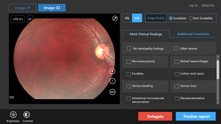 The Diabetic Retinopathy Screening Reading app is a smart and ingenious application which helps to screen patients for Diabetic Retinopathy (DR). The fundus images with relevant patient information (e.g. age, diabetic status etc.) are available to the application from various image acquisition sites. The subscribers of this application grade these fundus images to provide the clinical findings, observations, comments and recommendation in a predefined format. All this clinical information gets uploaded and translated into a DR Screening Report which will be available to the patient. Key features: