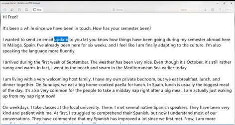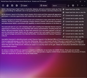 Notepad with speech to text (dictation), text to speech (TTS) and text to audio file capabilities. You can dictate short or lengthy narratives with punctuation marks, read whole or selected text aloud and convert text to audio files (wav, mp3, wma, m4a, flac, alac, hevc, mp4 and wmv).