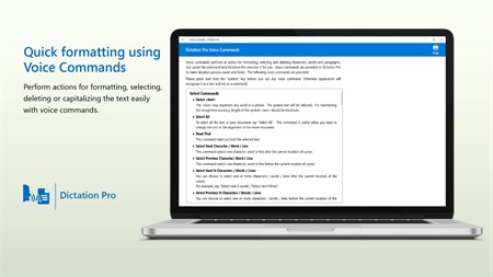 Quick formatting using voice commands Voice commands make it easier to interact with your computer without using the keyboard or mouse. Just speak the command and Dictation Pro will execute it for you. You can use voice commands to perform actions for formatting, selecting, deleting and capitalizing the text.