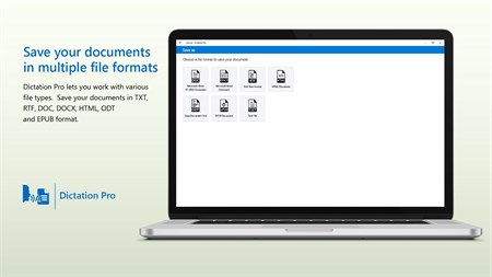 Supported file formats Dictation Pro lets you work with various file types. Save your documents in TXT, RTF, DOC, DOCX, HTML, ODT and EPUB format.