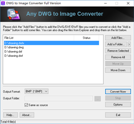 DWG to Image Converter allows you to batch convert DWG to TIF(TIFF)/JPG(JPEG)/BMP/PNG/GIF/PCX/WMF/EMF without the need of AutoCAD. It also batch converts DXF/DWF/DWFX to image format.