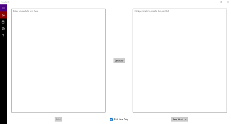 Simply type or copy/paste a paragraph and every word will become its own card. Simply click the print button, select your output size and print away, that’s it! Save your list of words so that you do not print out the same card twice.