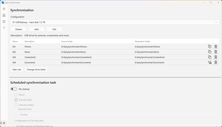 Easy Synchroniser is a simple but powerful application for comparing and synchronising folders. The software creates and manages backup copies of all your important files. The folders can be on different hard drives, on the network or on storage devices connected via the USB port.