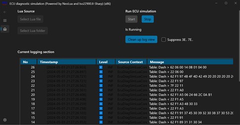 The purpose of EcuDiagSim is to simulate the Electronic Control Unit (ECU) diagnostic communication. More precisely, it simulates the response that an ECU returns to a request coming from a diagnostic tester. The definition of the simulated diagnosis communication is done in Lua. The transmission of the diagnosis communication down to the physics is ensured via an ISO22900-2 compatible vehicle communication interface (VCI).