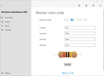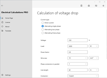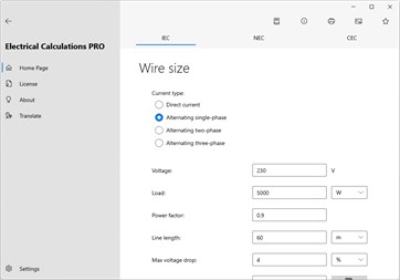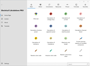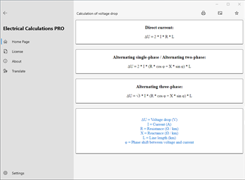 Main calculations: Wire size, Calculation of voltage drop, Calculation of current, Calculation of voltage, Calculation of active power, Calculation of apparent power, Calculation of reactive power, Calculation of power factor, Calculation of resistance, Calculation of impedance, Maximum wire length, Current carrying capacity of insulated conductors [PRO], Current carrying capacity of bare conductors [PRO], Current carrying capacity of busbar [PRO], Conduit fill [PRO], Sizing the circuit breaker [PRO], Admissible let-through energy of the cable (K²S²) [PRO], Operating current, Reactance [PRO], Impedance from resistance and reactance [PRO], Power factor correction [PRO], Power factor correction of transformer MV/LV [PRO], Capacitor power at different voltage [PRO], Earthing system, Maximum short-circuit current [PRO], Minimum short-circuit current, Maximum short-circuit current with transformer substation [PRO], Conductor resistance, Calculation of the cable temperature [PRO], Power losses in cables [PRO], Resistor color code, Inductor color code, Resistor colors from value, SMD resistor code, Capacitor code, Inductor alphanumeric code, Fuses, Sum resistors, Sum capacitors, Resonant frequency [PRO], Voltage divider [PRO], Current divider [PRO], Zener diode as voltage stabiliser [PRO], Resistance to reduce voltage, Resistance for led, Battery life, Primary/Secondary winding of transformer, Antenna length, CCTV Harddrive/Bandwidth calculator, Temperature sensors (PT/NI/CU, NTC, Thermocouples…) [PRO], Analog signal values [PRO], Joule effect, Risk assessment of overvoltages with atmospheric origin [PRO], Fault current of strings [PRO].