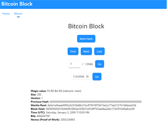 View and explore Bitcoin blockchain: - Load blocks from file, - Save selected blocks to file (date range), - Search block by id, - Search block by date, - View blocks (magic value, size, version, previous hash, merkle root, block hash, time, bits, nonce), - View transactions.