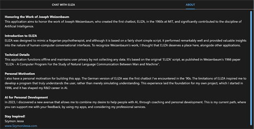 ELIZA was designed to mimic a Rogerian psychotherapist, and although it is based on a fairly short simple script, it performed remarkably well and provided valuable insights into the nature of human-computer conversational interfaces. To recognize Weizenbaum's work, I thought that ELIZA deserves a place here, alongside other applications.
