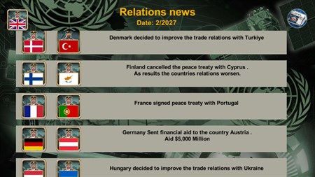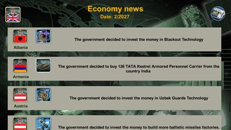 The game contains: Weapons Suppliers from around the world, a Spy Center, a War Room, Diplomats, United Nations, an Economy system, Technology, World News Distribution (Economy, Relations, Spy and War) and very advanced Artificial Intelligence.