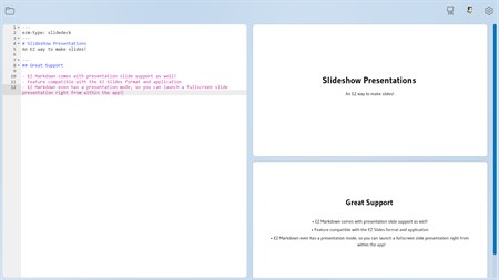EZ Markdown is a free markdown editor that is full featured and easy to use. Use it to create and edit markdown (.md) files. Also supports some extended features, including notes and slide presentations (see the screenshots for example). I will add more features and extension support upon request!