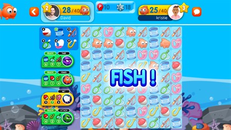 Fisk kan fanges ved at bytte og matche 3 eller flere af dem horisontalt eller vertikalt. Du kan også indsamle en række fiskeobjekter, så som flydende bøjer, kroge, fiskestænger, ormemadding og flettede ruser. De bruges til power-ups i spillet. Kunne du tænke dig at stjæle fisk fra din modstanders kurv? Har du brug for at øge din score øjeblikkeligt? Har din modstander en højere score end dig? Du kan indsætte et kæmpe udvalg af fiskeudstyr i kampen mod din modstander! Du skal bare sørge for at samle de rette kombinationer af objekter og vente på din chance for dit store træk.