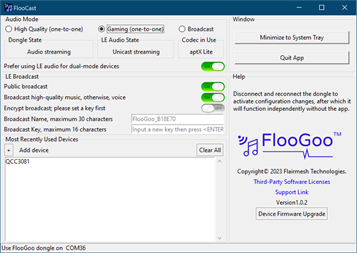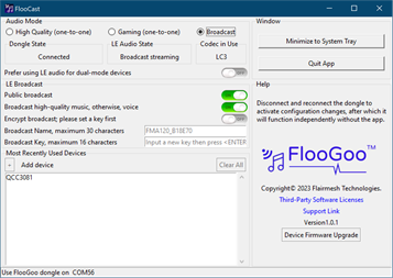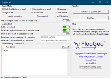 This Windows desktop application is designed for configuring Flairmesh Technologies' Bluetooth V5.4 dual-mode USB audio source dongle, the FlooGoo FMA120. It empowers users to customize its settings for different operational modes, including high-quality mode for Bluetooth A2DP audio streaming, low-latency gaming mode, and the latest Bluetooth low-energy audio features, such as public audio broadcast. Additionally, it provides the ability to verify the currently employed Bluetooth audio codec during streaming and broadcasting.