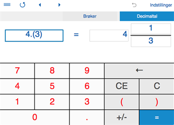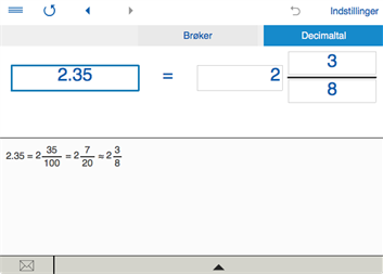 • OMREGNING AF BRØKER TIL DECIMALTAL OG OMVENDT Denne lommeregner omdanner brøker til decimaltal og decimaltal til brøker. Omskrivning af brøker til decimaltal: skal du vælge "Brøker", indtast en brøk, uægte brøk eller blandet tal og klik på "=". Omregning af decimaltal og uendeligt decimaltal (uendelig decimalbrøk) til brøk: skal du vælge "Decimaltal", indtast et decimaltal, og klik på "=". Indtast venligst decimaler i følgende format: Hvis du har 1,25, indtast 1.25 Hvis du har 0,24333..., indtast 0.24(3) Hvis nummeret er 5.123123... indtast 5.(123)