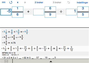 • REGNEMASKINE TIL BRØKER Regning med brøker, blandede tal, og hele tal. Addition, subtraktion, multiplikation og division 2 og 3 brøker.