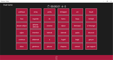 •French → Turkish 67,000 words and phrases. •Turkish → French 82,000 words and phrases. •Test, flashcard, listen test, writing, dual game and more... •French ↔ Turkish translator (online). You can translate text and listen. •1,100 phrases