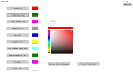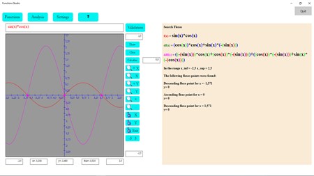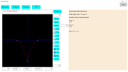 Function Studio f (x) with x real variable. Performs the study of the function in all its steps 1) Existence field 2) Intersection with Cartesian axes 3) Vertical asymptotes 4) Vertical and oblique asymptotes 5) First derived study (maximum and minimum) 6) Second derived study (flex) . The full function study can be invoked by the pull-down menu. The results box allows you to copy all of its contents that can then be exported to any word processor. It is possible to follow the function at any point thanks to the many zoom and pan activates both wisely (x or y axis) together. All the functions studied can be stored in a database and optionally recalled (visual help for recognizing the desired function) or permanently deleted from the database. All colors in the design field can be customized at will. You can then restore default colors with a click or touch. Help contains a list of primitive usable functions with some suggestions for good entry of functions. PS: To avoid errors the field that contains the function (above the graph) is read-only, so if you want to enter a new function you have to click Insert in the function menu, then write the function and click Validate to check for any errors will calculate the derivatives first and second and will show them to the right.