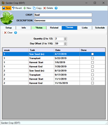 Create your own personal garden to do list. Garden Time calculates for you the suggested dates (based on frost dates you specify) of when to sow your crops, either from seed or plants, when to transplant them into the garden, and when to begin and end harvesting for each selected crop.