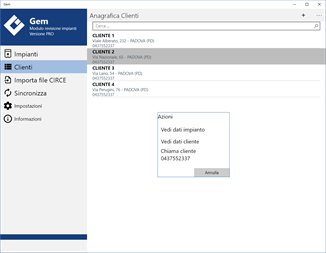 Gem è uno strumento modulare per i professionisti delle manutenzioni degli impianti La funzionalità REVISIONI permette di tenere traccia degli interventi manutentivi sugli impianti di riscaldamento. Permette la rapida visualizzazione degli impianti da revisionare e di inviare ai clienti selezionati un avviso tramite SMS / email o di produrre delle lettere da stampare. Dispone della funzionalità di importazione dei files CIRCE del catasto impianti termici e crea o aggiorna automaticamente i dati dell'impianto. La funzionalità LETTURE permette di gestire la raccolta dei dati delle letture delle varie utenze nei complessi abitativi. É possibile definire varie tipologie di lettura con le relative scadenze e associarle ai vari utilizzatori. In ogni momento è possibile estrarre un foglio excel con tutti i dati raccolti. La funzionalità INTERVENTI permette di tenere traccia dei dati relativi agli interventi manutentivi fatti presso i clienti con eventuale documentazione fotografica.