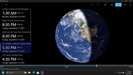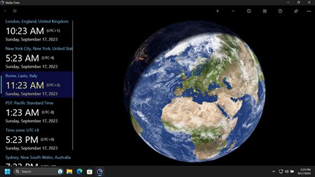 This application provides you information about local times in cities around the world. Additionally it shows Earth so it is very easy to find out, if it is day-time or night at specific locations. It is possible to select a city and the globe rotates, so that selected city is in the center.