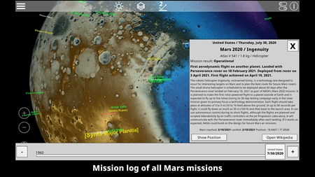 GlobeViewer Mars is an interactive and three-dimensional globe of the entire surface of Mars. The 3D global map shows all official designations for various surface features. If you are interested in a specific region, an even higher resolution local 3D map view can be loaded for a closer look at the craters, mountains and other formations. In addition, a mission log of all Mars missions since 1960 has been included.