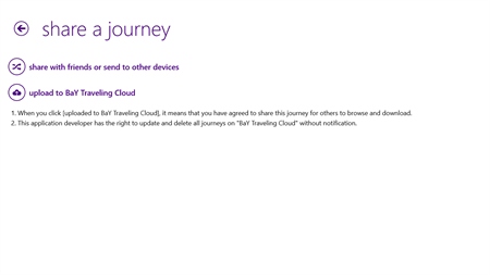 “Play alone; better together”! Upload your journey to the “BaY Traveling Cloud”, it can be shared with more people. When you do not know where to go play, just click [where to go] on this app to browse more interesting journeys on the “BaY Traveling Cloud”. You can also use [easy note] to record the address, longitude and latitude of the interesting place (automatically positioning) at anytime, anywhere. What a really intimate journey planning helper!
