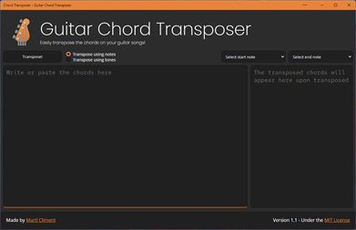 Transpose your guitar songs to match your voice pitch. Transpose selectinng initial and final note or transpose by semitones. This website is 100% free, no paid extra features or anythong similar. Enjoy :)