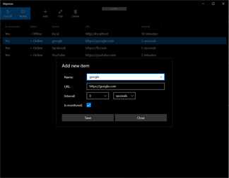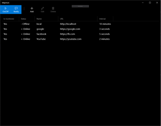 httpmon is a small tool to monitor websites availability. Define websites with monitoring intervals and see if they are available. You can define intervals in seconds, minutes or hours from 1 to 60. Also there is a feature to get local (toast) notifications, when the website becomes unavailable. There is ability to include/exclude website from monitored collection at any time without deleting it. Hope it will be useful.